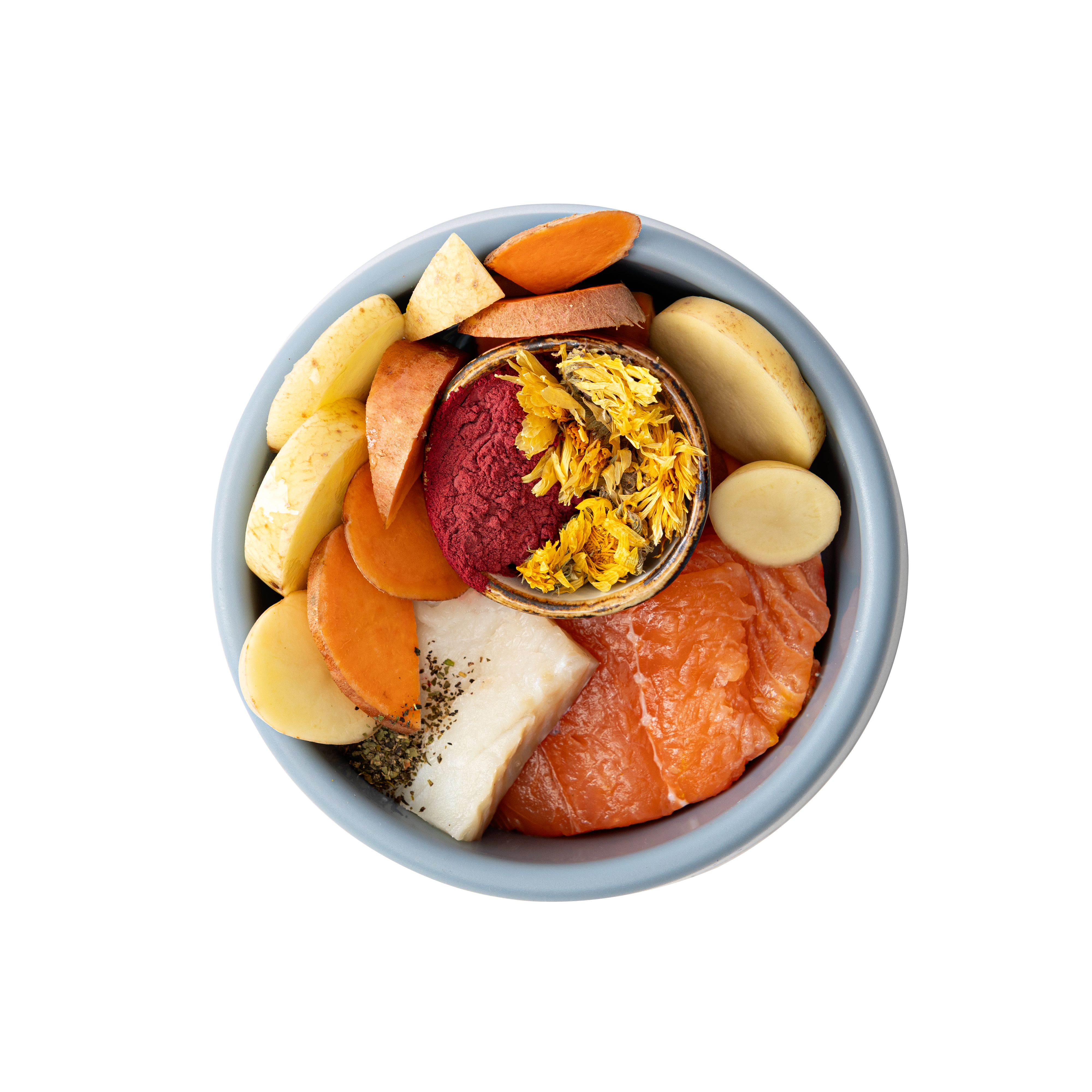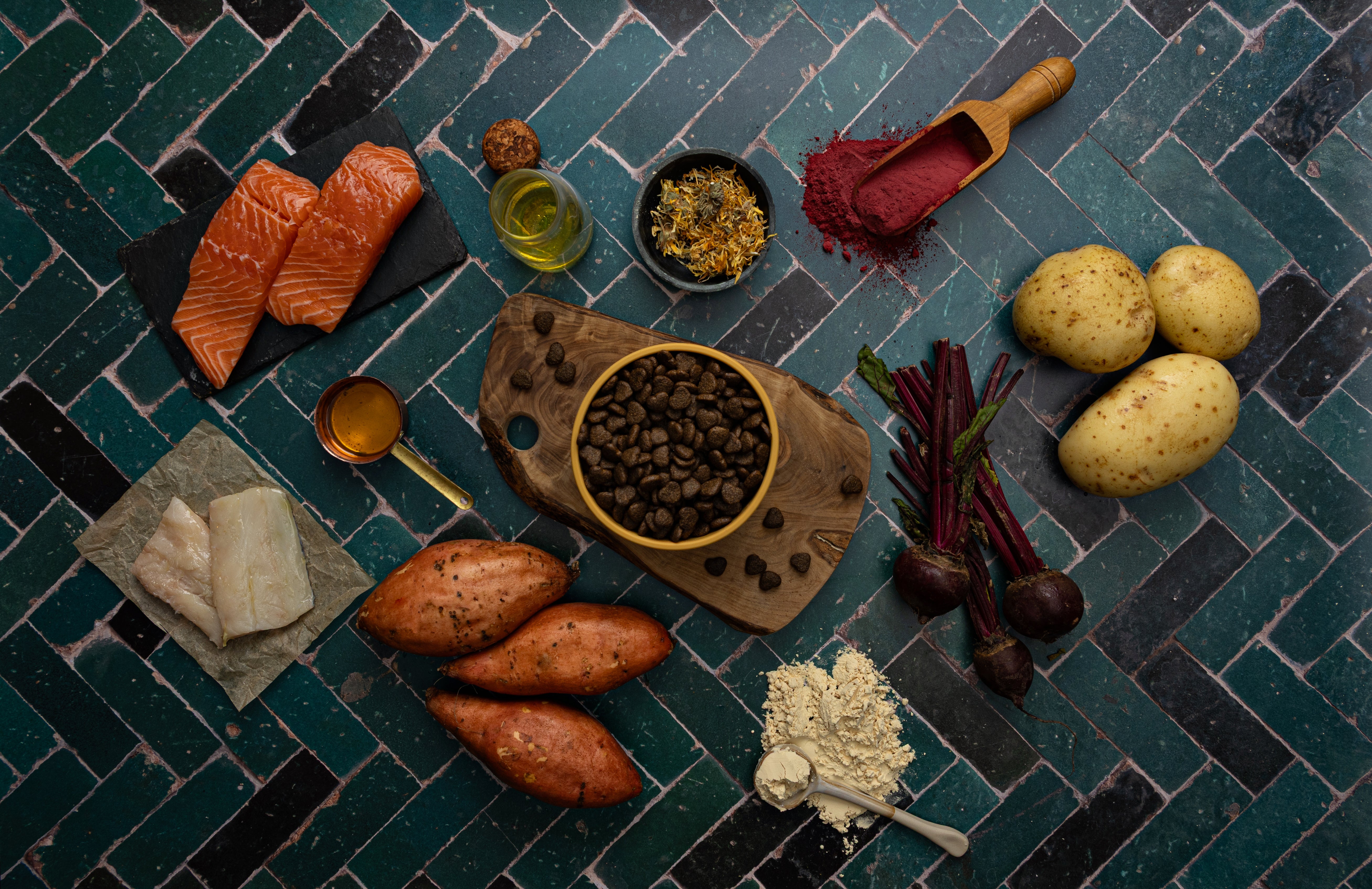 Freshly Prepared Hydrolysed Salmon (35%), Potato, Sweet Potato, Hydrolysed Dried White Fish (14%), Salmon Oil (4%), Beet Pulp, Soya Oil (3%), Hydrolysed Salmon Gravy (2.5%), Minerals, Dried Algae (Schizochytrium sp.) (0.2%), Borage Oil (0.2%), Marigold (Source of Lutein)