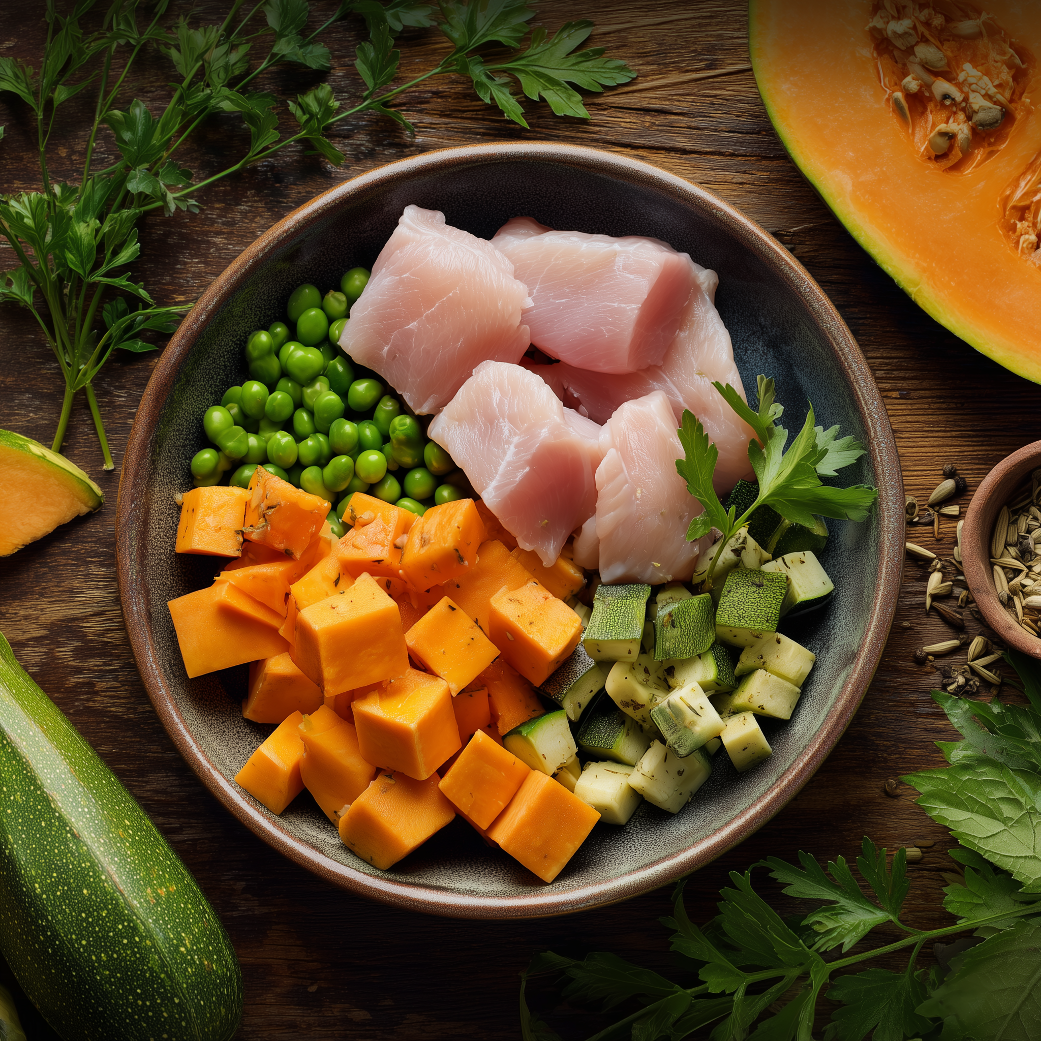 Fuel your small senior dog with the gentle nutrition of free-range turkey in our WholeBuddy Superfood 65 recipe. Crafted with 65% turkey, including 35% freshly prepared free-range turkey, this lighter meal is rich in essential amino acids to support lean muscle while helping to maintain a healthy weight. Specially designed for older small breed dogs, it combines reduced fat levels with highly digestible protein for balanced senior nutrition. The carefully selected blend of parsley, papaya, nettle, zucchini, and pumpkin provides natural antioxidants, fibre, and digestive support, ensuring a wholesome and delicious diet that promotes vitality and wellbeing in your dog’s golden years.