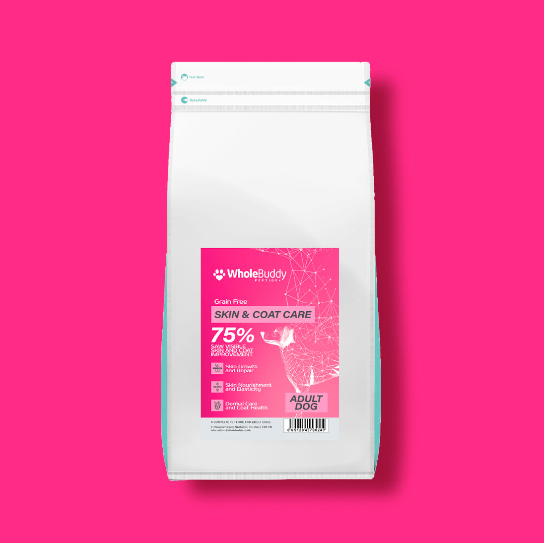 Transform your dog's skin and coat with our revolutionary WholeBuddy Peptide+ Skin & Coat Care formula. This advanced recipe harnesses the power of hydrolysed salmon peptides to nourish skin at the cellular level, while rich sources of omega-3 and omega-6 fatty acids promote a soft, lustrous coat. Specially developed for dogs with sensitive skin, itching, or dull coats, our innovative Freshtrusion® HDP technology creates small chain peptides that minimize allergic reactions while maximizing nutrient absorption. In trials, 75% of pet owners reported visible improvements in their dogs' skin and coat condition. Watch your dog's transformation to healthier skin and a more radiant coat with this breakthrough hypoallergenic formula.