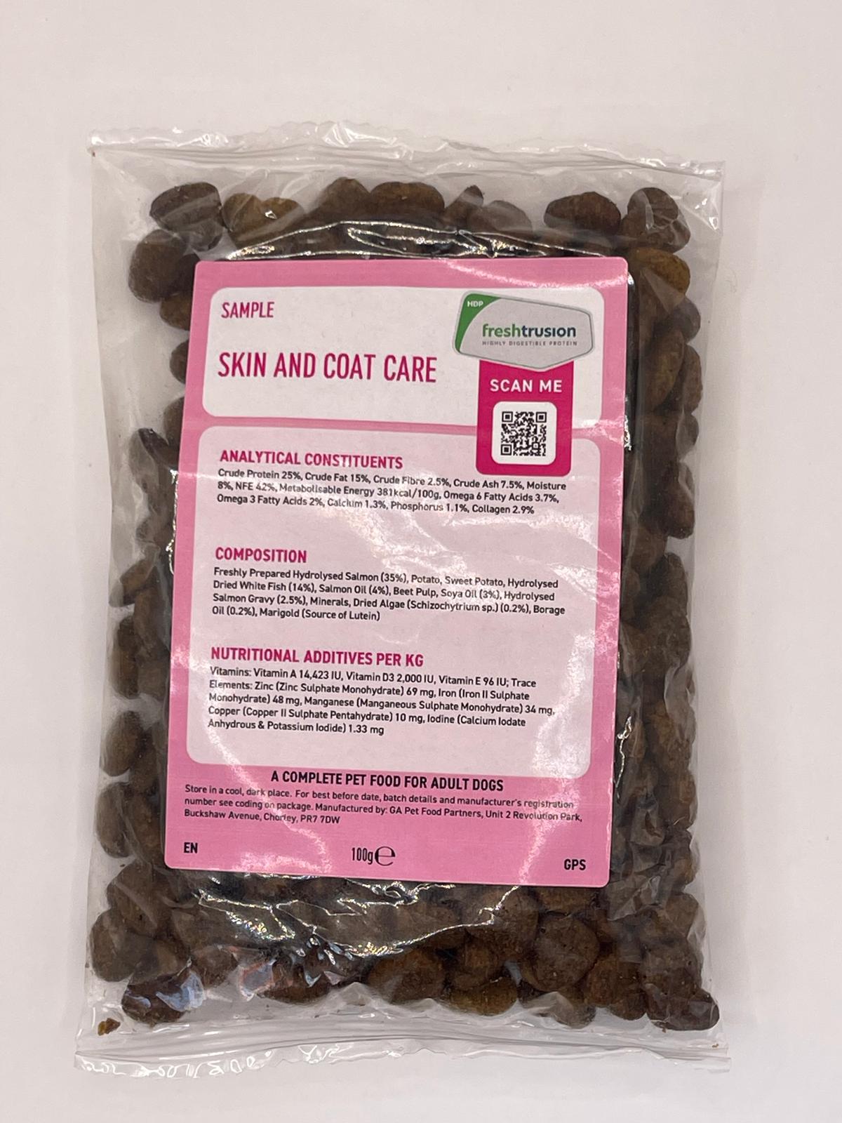 Freshly Prepared Hydrolysed Salmon (35%), Potato, Sweet Potato, Hydrolysed Dried White Fish (14%), Salmon Oil (4%), Beet Pulp, Soya Oil (3%), Hydrolysed Salmon Gravy (2.5%), Minerals, Dried Algae (Schizochytrium sp.) (0.2%), Borage Oil (0.2%), Marigold (Source of Lutein)