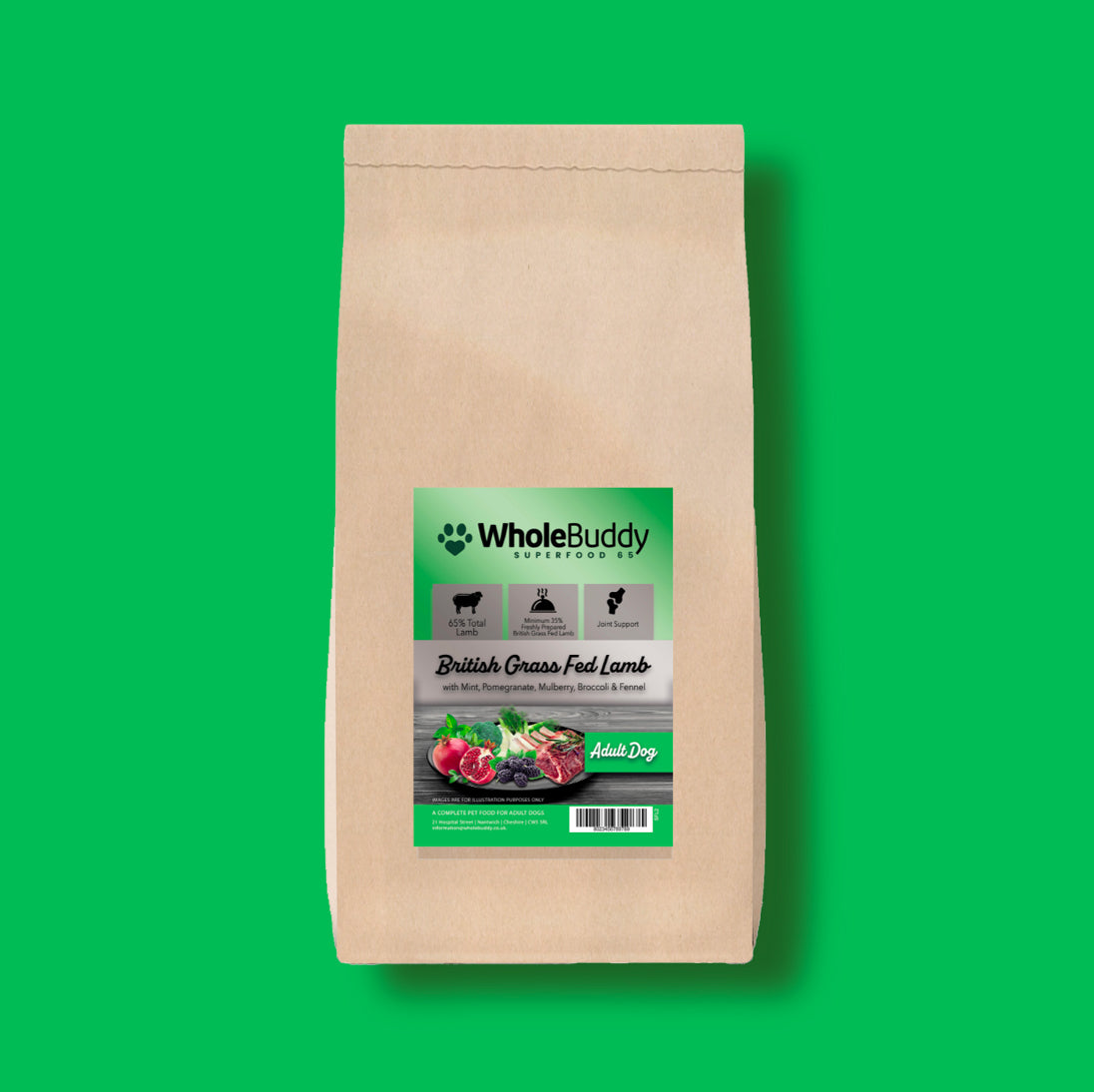 Give your dog the best with our WholeBuddy Superfood 65 grain-free lamb recipe, made with 65% total lamb, including 35% freshly prepared British grass-fed lamb....
